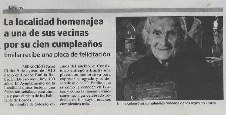 Hoy 9 de Agosto de 2010, la tía Emilia ha cumplido 100 años y todo el pueblo de Loscos lo ha celebrado de manera unánime. A lo largo del día han ido pasando por su casa todos los vecinos del pueblo para manifestarle su alegría por ese magnifico cumpleaños y en la esperanza que siga haciéndolo muchos año, que seguro así lo hará, ya que se mantiene en perfectas condiciones de salud, solo el oído le falla un poquico (aunque según dicen, para lo que quiere...) |