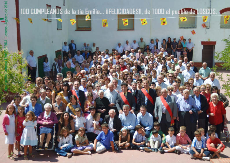Con motivo del cumpleaños CENTENARIO de la tía Emilia, el 9 de Agosto de 2010, todo el pueblo de Loscos lo celebro de manera unánime. También desde esta Asociación pusimos en marcha una idea que tuvo una gran aceptación, como fue la foto de todo el pueblo, junto a ella y sus familiares, y que llevamos a cabo el día de San Roque con gran concurrencia. Para los más curiosos, comentar que en la foto hay más de 200 personas. Por todo ello manifestamos nuestra alegría por el hecho y nos unimos a todos los losquinos para felicitar a la tía Emilia y a su familia por este GRAN CUMPLEAÑOS. |