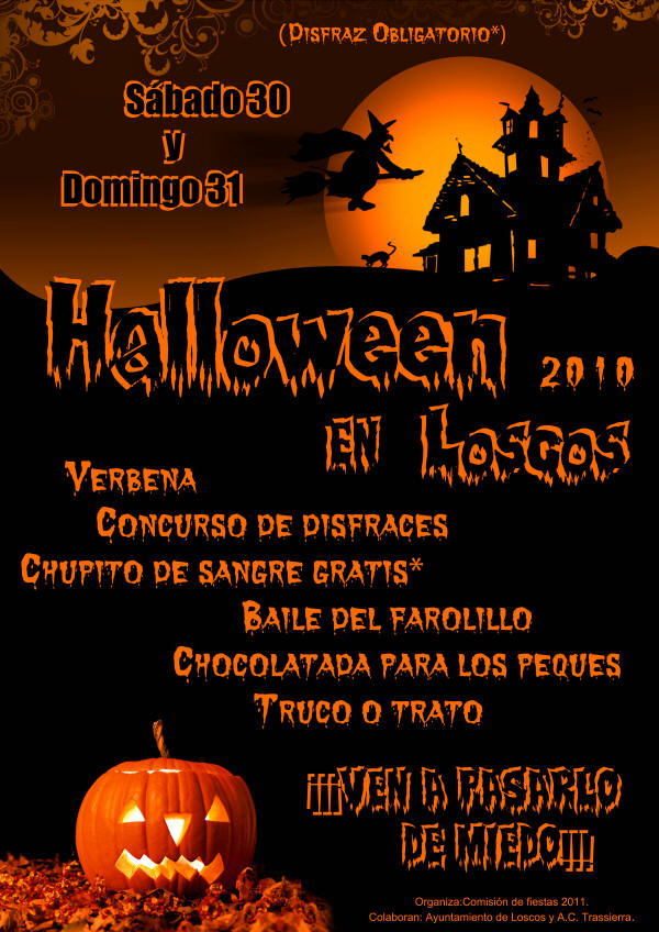 | La COMISIÓN DE FIESTAS de LOSCOS organiza una VERBENA para la noche del 30, sábado, para CELEBRAR la fiesta de HALLOWEEN. El programa incluye una QUEIMADA popular y además lo que podéis ver en el cartel. | |||