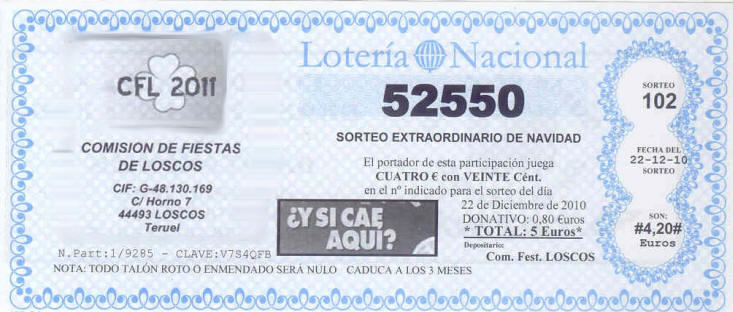 LOTERÍA NAVIDAD. Como todos los años ya están por ahí repartidos, parte de los talonarios de lotería navidad que saca la Comisión de Fiestas. Como siempre decimos, es muy importante la colaboración de todos a la hora de la distribución y adquisición, para ir ayudando a la financiación de las fiestas, pues es una de las fuentes mas importantes y que incidirán en gran manera en el precio de los bonos. Además, tarde o temprano vamos a resultar agraciados con un premio gordo. Porque nos lo merecemos. Así es que nadie se descuide, por si acaso ESTE AÑO TOCA. |